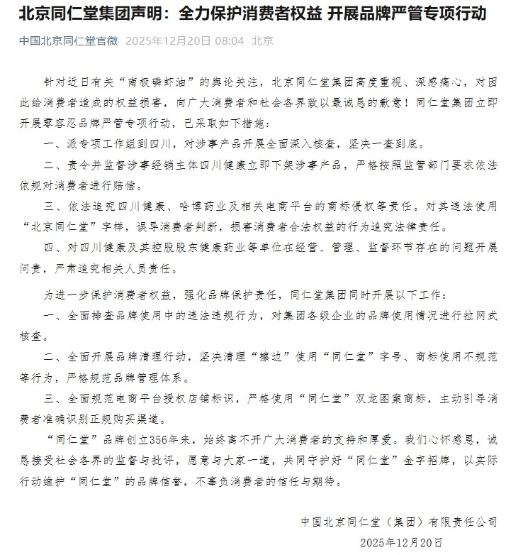 中国北京同仁堂(集团)有限背负公司12月20日发布声明: