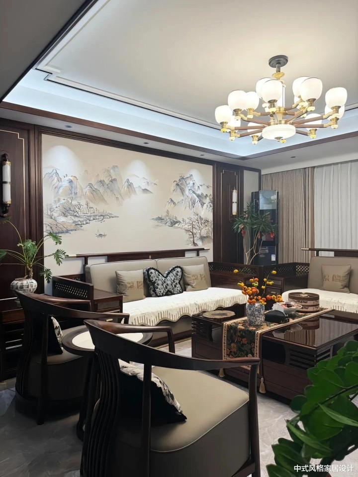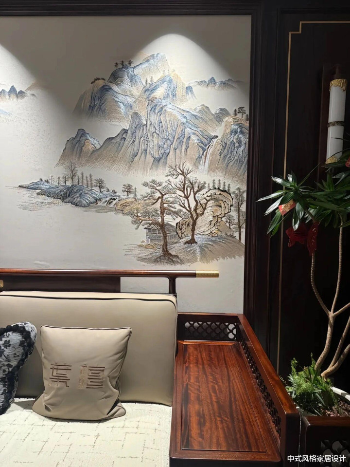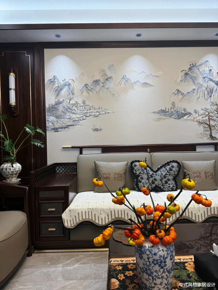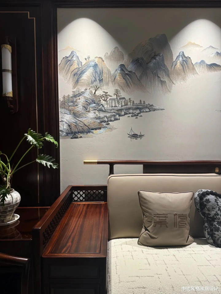 客厅里地砖是极简的水彩灰,茶几上摆放着青瓷花瓶;沙发线条是当代从简的,面料却是手工刺绣的云纹;最绝的是沙发配景墙上的大幅水墨山水画,让空间里充满了传统文化意蕴。