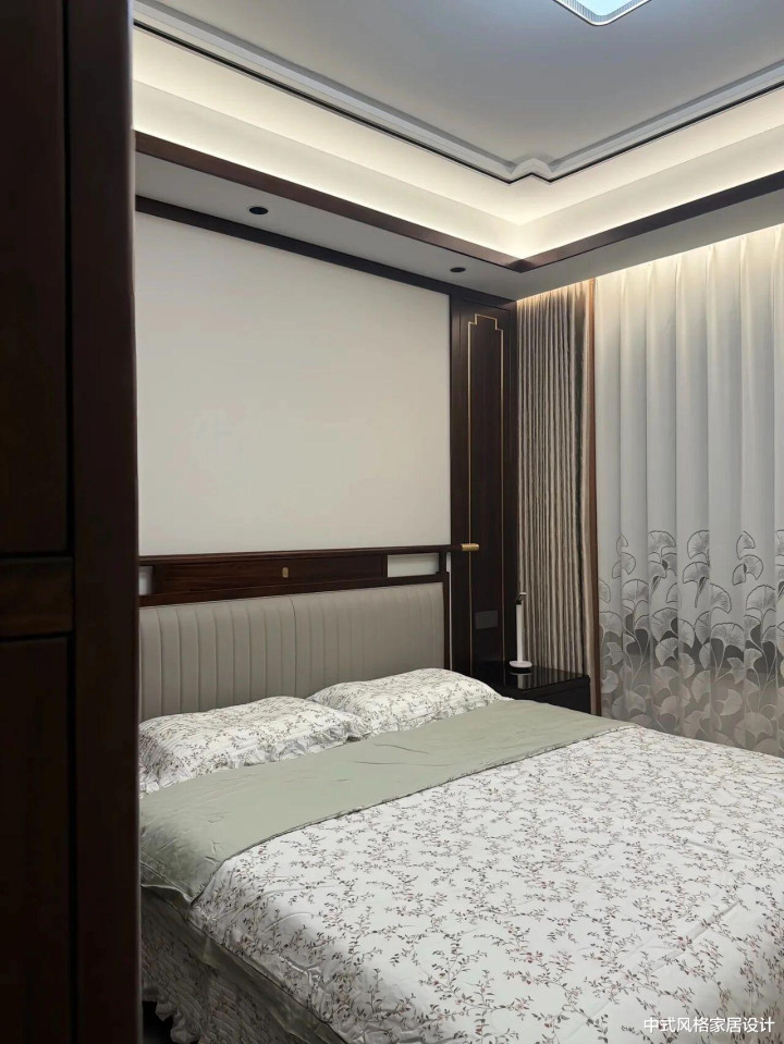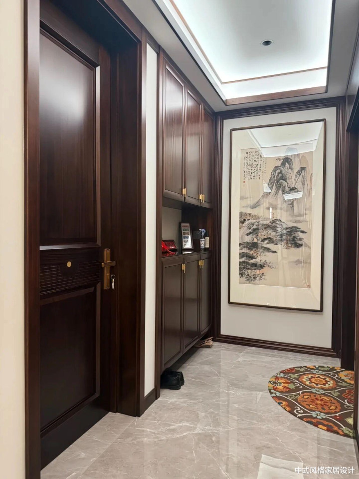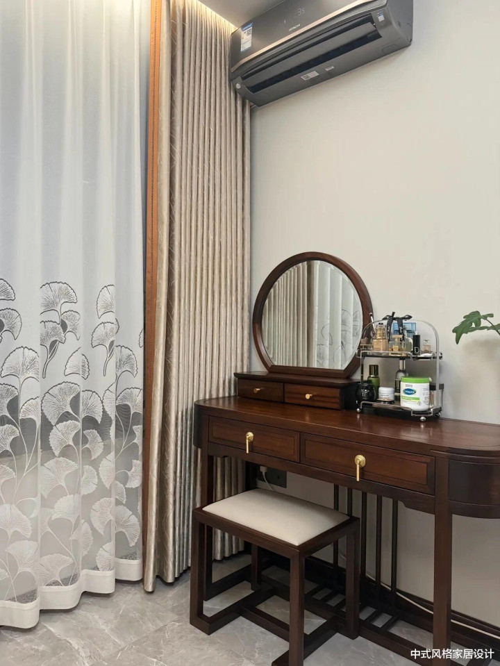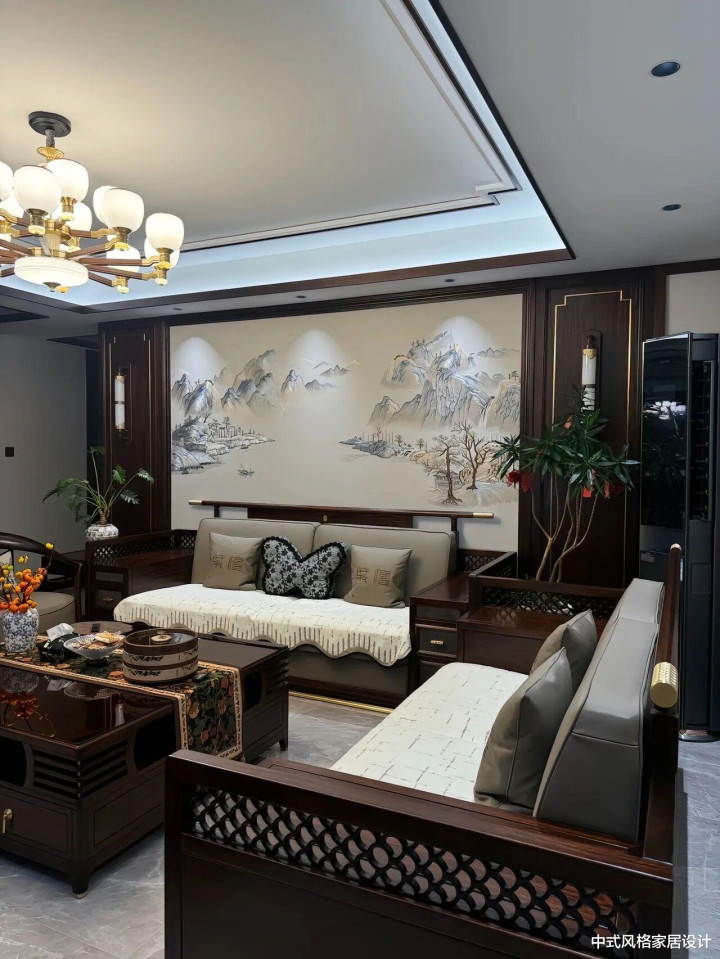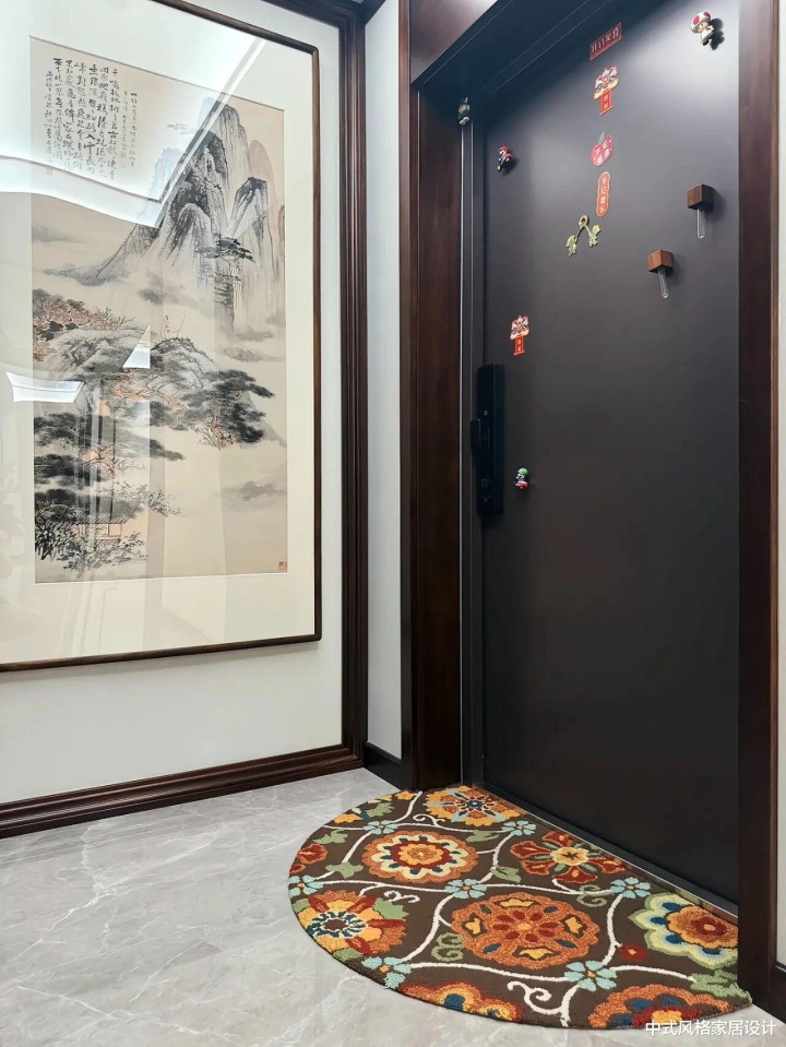 客厅里地砖是极简的水彩灰,茶几上摆放着青瓷花瓶;沙发线条是当代从简的,面料却是手工刺绣的云纹;最绝的是沙发配景墙上的大幅水墨山水画,让空间里充满了传统文化意蕴。