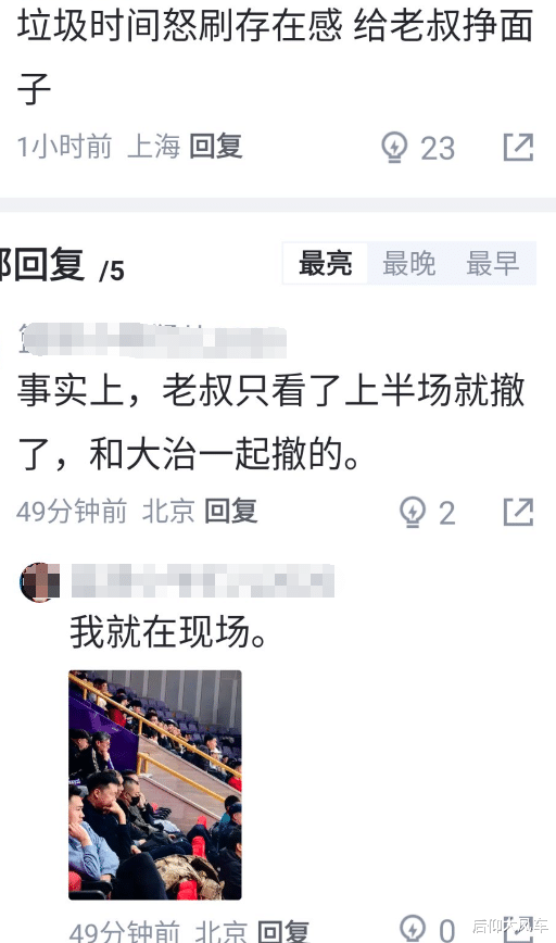 赛后有球迷给出了这么的评价:垃圾时候怒刷存在感,给老叔挣雅瞻念;随后有现场球迷在这条驳斥下方恢复:事实上,老叔只看了上半场就撤了,和大郅通盘撤的。况且还附带了现场拍的相片,诠释这一场廖三宁发达确乎太差,就连郭士强齐没眼看了。