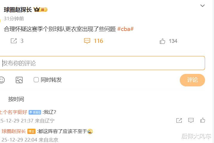 今晚CBA就2场比赛,赵探长莫得明说是北控,但他鄙人方驳斥区还是扼杀了辽宁的嫌疑,因此具体是哪一支球队出现了更衣室问题,可想而知了。